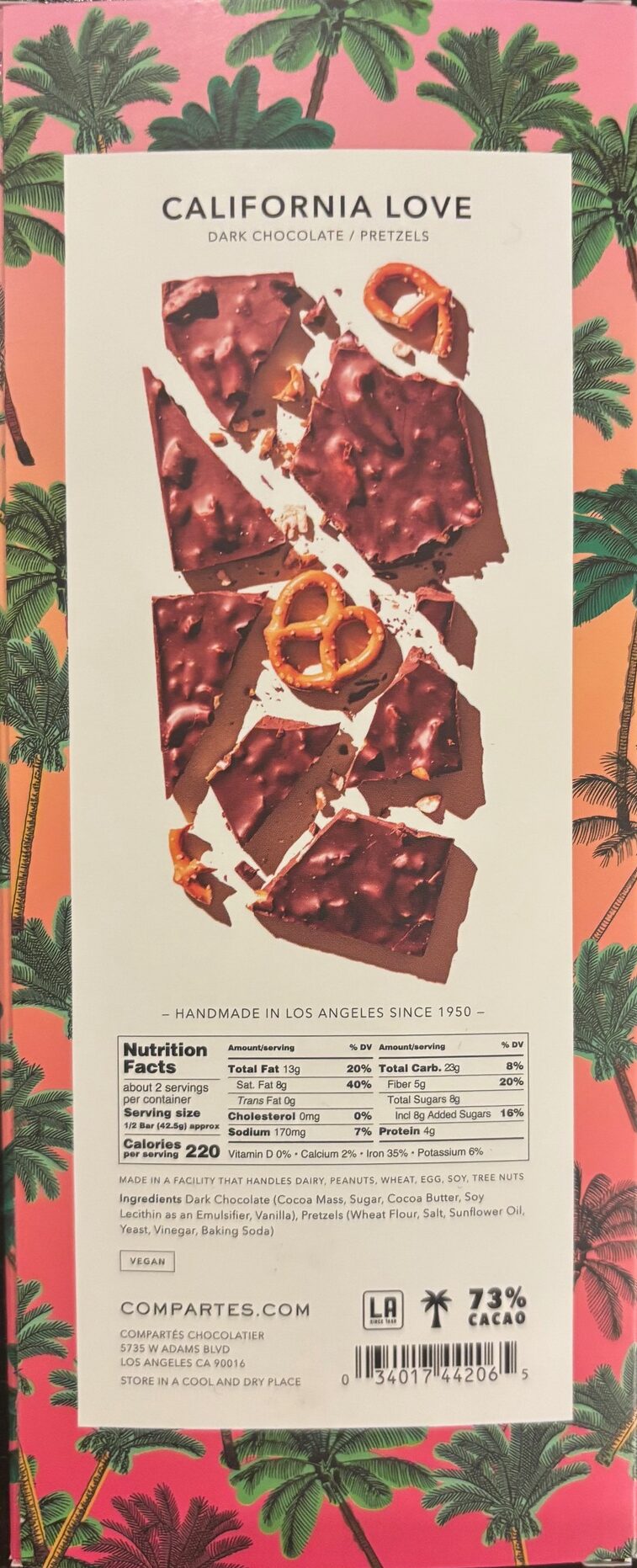 Compartes’ California Love blends rich dark chocolate with the crunch of pretzels and a touch of sea salt for a perfect balance of flavors. Handcrafted in Los Angeles, this gourmet bar embodies the vibrant spirit of California in every bite.